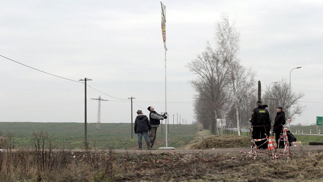 The small town Swiebodzin is situated on the transit road between Berlin and Warsaw. It is neither known for historical reasons nor for its tourist attractions, but that changed through the inauguration of the biggest Jesus monument in November 2010. The film facing the scene pays attention to the surroundings and narrates the event by focussing mainly on the reactions and the behavior of the spectators. It concentrates on the preparation of this event and its dismantling at the end of the day without showing the happening as it is normally broadcasted by mass media. By looking at individual subjects as single parts of a larger community that is created through the celebration of the event the film creates a kind of narration that is constructed only by singularities passing by one after another. Deliberately the film is presented without subtitles, because the sound itself is used as an atmospheric soundscape, which emphasizes the ritual character of such events. It tries to equilibrate social, political and religious dimensions of such kind of events by figuring out their complexity and by stressing the interrelation between modernity and tradition, between urbanism and periphery, between consumer culture and power play.